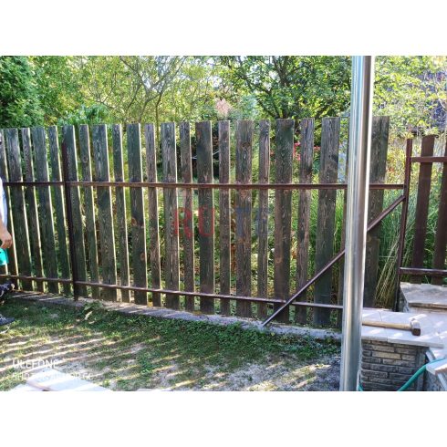 A vevő kérésére a régi vasszerkezetű és deszka burkolatú kerítést elbontottuk, de a jó állapotban lévő sávalapot meghagytuk. Az új oszlopokat alapcsavarokkal rögzítettük a betonra majd felszereltük a kerítés táblákat is. 1,7m magasságú a kerítés és 50 méter hosszú. A terasznál kellett az egyik táblán rövidíteni mind hosszúságban mind pedig magasságban. Stabil és időtálló kerítést telepítettünk.
